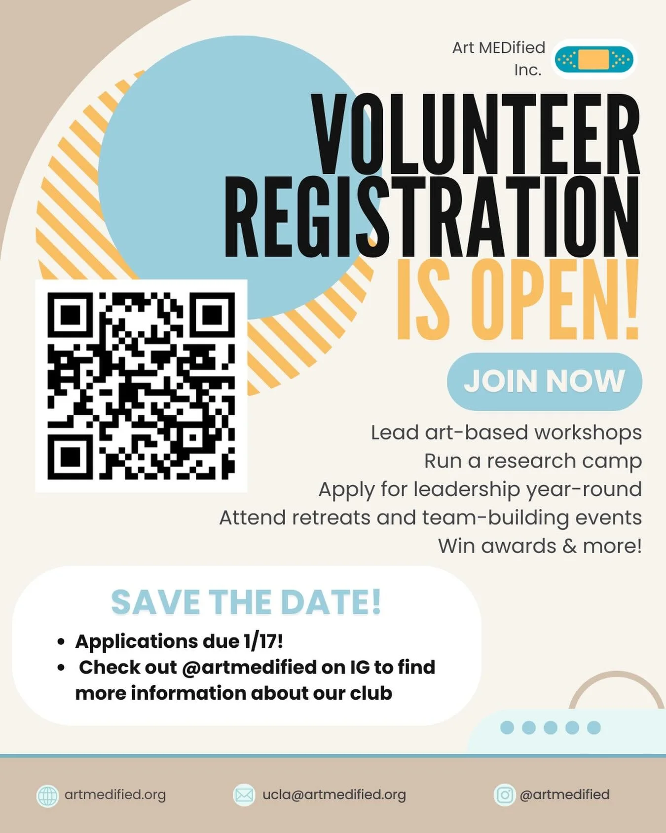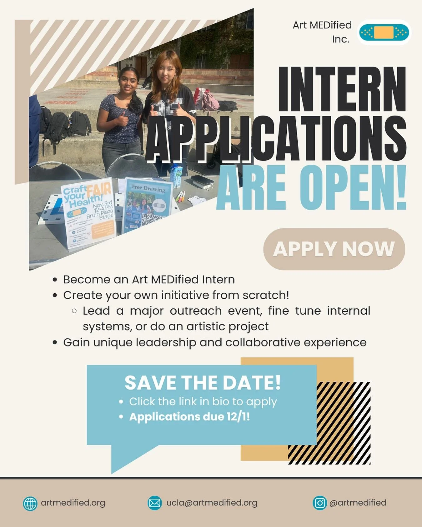 We’re always looking to bring additional volunteer and professional development opportunities to you! One of our favorites are guest speaker sessions, our blog, and fundraisers. Our guest speaker events to allow club volunteers to get a glimpse of the careers of medical professionals and further explore what career in medicine they’d like to pursue. Meanwhile, our blog (Bandages & Brushstrokes) has provided chapter volunteers with the opportunity to publish educational articles and have their voices heard. Lastly, fundraisers are a great way to give back to the Art Medified community and help us continue bringing the world of health literacy and art to others!